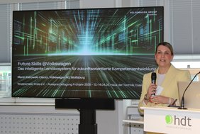 Die nachfolgende Key Note hielt Frau Maren Kabowski-Ciecior, Leiterin Bildungsstrategie und Skill Management bei Volkswagen. Sie setzte die Themenreihe Transformation und betriebliche Weiterbildung am Beispiel der Volkswagen AG fort und zeigte auf, wie VW die Vermittlung von Future Skills in einem ausgefeilten Lernökosystem organisiert.